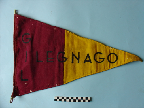 in tela, a forma triangolare, a due bande verticali, una gialla (la più esterna) e una rossa (la più interna). Scritta ricamata in filo nero su entrambe le facce. Agli angoli di base, due asole in fettuccia.