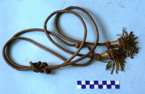 Con cordoncino dorato annodato a metà; nappa a losanghe e canottiglia dorate a coprire la noce.