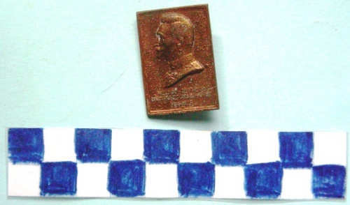 A forma di rettangolo. Al centro, in rilievo, rivolto a destra un ufficiale in alta uniforme. Iscrizioni lungo il lato inferiore. Sul verso, spilla di fissaggio.