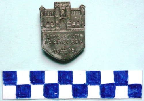 A forma di scudo bipartito. Sulla parte superiore, in rilievo, una porta d'accesso turrita ad una città, sopra la porta la statua del santo protettore. Iscrizione sulla parte inferiore. Sul verso, spilla di fissaggio.