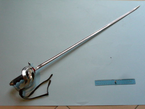 Lama dritta a filo, punta e controfilo; sgusciature sui due lati per i primi tre quarti, per l'ultimo quarto doppio sguscio con punta al centro; incisa ad acido per tre quarti a motivi militari e floreali. Fornimento tipico con guardia e due elsi di ampia larghezza. Corto ramo di parata a riccio con conchiglia per il pollice. Cappetta lunga, arrotondata, con dorso zigrinato nell'ultimo quarto. Bottone piatto, tondo, avvitato al codolo. Impugnatura anatomica. Rivestimento al tallone; è presente anche la dragona.