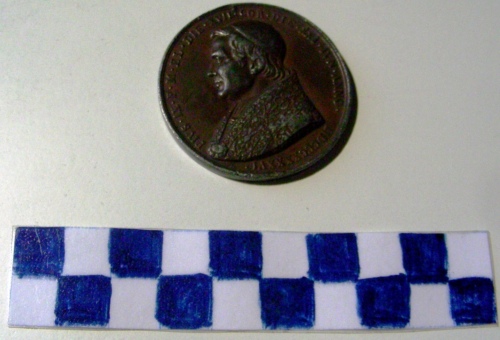Di forma circolare. Sul recto, al centro in rilievo, busto accollato a sinistra di Pio IX con berretto e piviale. Iscrizioni lungo la corona. Sul verso, busti accollati, in rilievo, a destra dei SS. Pietro e Paolo. inscrizione lungo la corona.