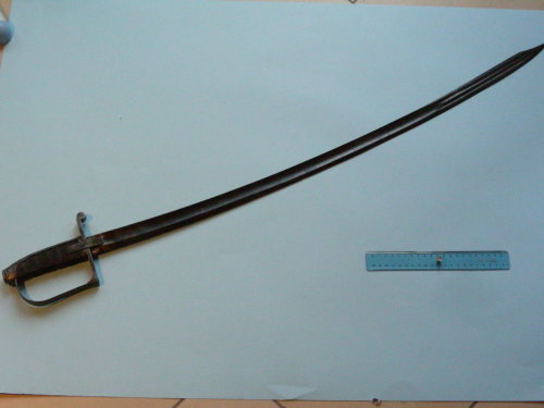 standard militare, lama curva, a filo, punta e controfilo. Ampie sgusciature sui due lati, per i primi tre quarti; per l'ultimo quarto, due sgusci al centro per la lunghezza del controfilo. Punta ribassata alla pandura. Fregi ad acido a motivi militari e floreali su entrambi i lati della lama per la prima metà. Guardia a staffa ad un solo ramo; ramo di parata a riccio con spacco per dragona; alette fermafodero rettangolari; cappetta lunga con dorso sfaccettato. Tipico bottone ottagonale avvitato al codolo. Impugnatura a settori zigrinati separati da cinque scanalature.