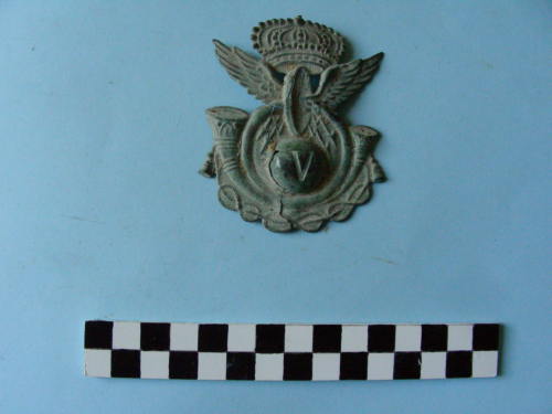 stemma metallico formato da strumento musicale (corno) sormontato da cerchio da cui fuoriescono due ali spiegate di aquila; il tutto è concluso da una corona, mentre sotto vi è una fila di tre nodi sabaudi. Al centro dello stemma semisfera in rilievo; sullo sfondo si intravvedono quattro saette zigzaganti.