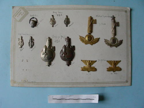 Pannello bianco decorato con cornice dorata a stampa. Vi sono attaccati undici fregi di cui otto decorati da fascio littorio, sei con scure verso destra, due con scure verso sinistra; quattro con scudo e daga; due con foglie d'alloro e scudo; uno a forma di anello con profilo del duce; due a forma di aquila che stringe un moschetto sopra un libro.