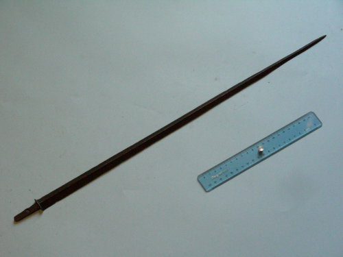 Dritta; sezione triangolare (a tre fili); tallone tipico. Punta simmetrica al centro. Conserva parte del codolo con un anello per il fissaggio dei fornimenti.