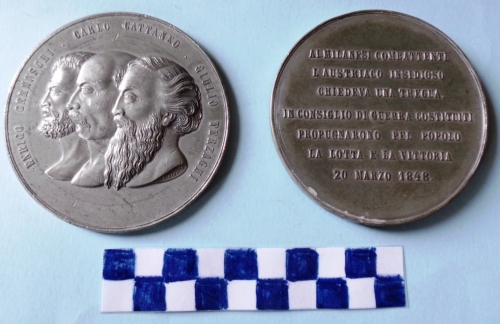 Di forma circolare. Sul recto, al centro, in rilievo i profili accollati a sinistra di Cernuschi, Cattaneo e Terzaghi. Iscrizioni lungo la corona e sotto la figura a destra. Sul verso, al centro, in rilievo iscrizione.
