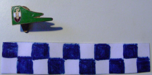 Fiamma a due punte di colore verde, con fascio littorio dorato a destra sovrapposto a tricolore in ovale. Sul verso, fermaglio a goccia rovesciata