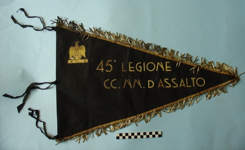 a forma triangolare. Al dritto, tela nera con scritte ricamate a filo dorato, decorata nell'angolo in alto vicino all'attaccatura con un'aquila dorata ad ali spiegate che poggia su un fascio littorio con scure a destra. Al rovescio, tela rossa con scritte ricamate a filo dorato, decorata nell'angolo in alto vicino all'attaccatura con stemma ricamato. Frangia dorata al bordo dei due lati maggiori. Tre nastri di fissaggio allasta sul lato minore.