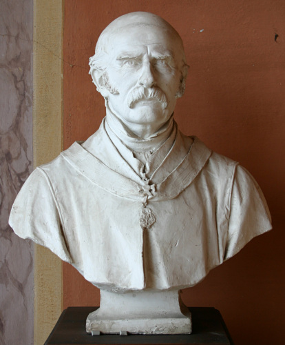 Ceccon eseguì nello stesso anno questo busto del duca Silvestro Camerini e quello della sua sposa Eurosia Mantovani. Il "capostipite" della famiglia Camerini acquisì il complesso di villa Contarini nel 1852 dai Correr-Giovanelli. Di modestissime origini, Silvestro nacque a Castel Bolognese nel 1777. Nell'arco di una vita egli seppe costruire una vera e propria fortuna ecomonica, il cui inizio coincise con il trasferimento della famiglia a Ferrara. Camerini iniziò con l'assumere lavoratori giornalieri per l'ottenimento di appalti, sempre più ingenti, relativi alla costruzione e riparazione degli argini dei fiumi. Contestualmente iniziò un lucroso commercio della sabbia e della ghiaia ricavata dai fiumi nei quali si ponevano le arginature. Nel 1825 ottenne l'importante appalto per la costruzione e consolidamento di tutte le strade nazionali dello Stato Pontificio. Nel tempo la sua fortuna crebbe al di qua e al di là del fiume Po, ed egli accumulò possedimenti tanto nel Regno Lombardo-Veneto quanto nello Stato Pontificio. Contestualmente si distinse in numerosi atti di beneficenza, quali ad esempio l'importante finanziamento effettuato nel 1823 per il restauro della Basilica di San Paolo fuori le Mura a Roma, distrutta da un incendio (Cfr. G. Doro, Da bracciante a Duca: Silvestro Camerini appaltatore, esattore e proprietario nel Veneto dellOttocento, Tesi di laurea, Rel. Prof. A. Ventura, Facoltà di Lettere e Filosofia, Università degli Studi di Padova, a.a. 1989-1990). Nel 1846, poche settimane dopo l'elezione al soglio pontificio, Pio IX, che conosceva da tempo Camerini e la sua attività filantropica, gli conferì la Croce di Commendatore Cavaliere. Nel busto in esame, dalla posa e dall'abbigliamento severo, Ceccon, pur nella semplicità dell'abito, pone in risalto tale onorificenza, indangando vieppiù lo sguardo sicuro e penetrante del vecchio duca.