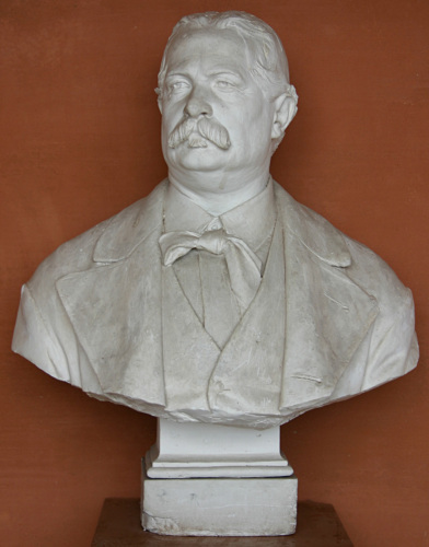 Luigi Camerini (1819-1885), rimasto orfano in giovane età, fu allevato dallo zio Silvestro, alla morte del quale (1866) ne ereditò le sostanze e i beni di Piazzola. A lui si devono molti dei lavori di restauro e di abbellimento che risollevarono le sorti della villa in abbandono. Fu sua la fortunata idea di commissionare a Giovanni Duprè il monumento allo zio Silvestro collocato all'interno del mausoleo antistante l'ingresso della villa di Piazzola sul Brenta (P. Camerini 1929, p. 430). Sempre a lui si deve, con tutta probabilità, la commissione a Luigi Ceccon del bassorilievo, raffigurante un episodio della vita del Duca Silvestro, inserito all'interno del monumento, previo parere favorevole di Duprè. Il busto in oggetto fu eseguito nel 1866, anno di morte del Duca e conseguente assunzione dell'eredità famigliare da parte del nipote. Ceccon, nel ritrarre l'erede Camerini, ne evidenzia l'espressione ferma e intensa dello sguardo, che in ossequio alla più consolidata delle iconografie, "guarda lontano". In villa si conserva un altro busto consimile realizzato nello stesso torno di tempo.