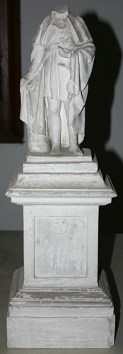 Nell'elenco delle opere riferite a Luigi Ceccon, presente nella Guida della villa del 1926, si segnala la presenza di diversi bozzetti per monumenti dedicati, di volta in volta, a Petrarca, Paleocapa, Vittorio Emanuele e Giuseppe Mazzini. Tale notizia, confortata dall'analisi stilistica indurrebbe ad assegnare, seppur dubitativamente, anche quest'opera allo scultore padovano. La foggia del personaggio rimanda a un'epoca medioevale, non certo moderna.