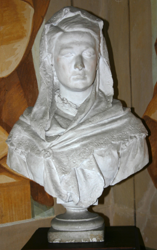 Il busto fu eseguito nello stesso anno del Ritratto d'uomo esposto sempre nella Sala del ratto di Proserpina (inv. I-25). Le due opere potrebbero esser state eseguite in coppia, considerate anche le simili dimensioni. La donna appare elegantemente abbigliata entro un fine scialle ricamato, che dal capo scende fino alle spalle e annodato al petto con un fiocco. Il colletto della camicia riprende gli eleganti decori dello scialle.