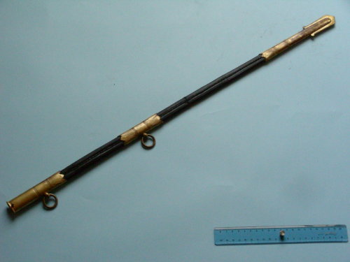 in lamierino rivestito di cuoio nero. Il puntale, la fascetta e la cappa sono in bronzo dorato con incisioni al cesello a motivi floreali. Due campanelle, una sulla fascetta e l'altra sulla cappa. Sulla cappa è presente un piolo che ha la funzione di fissare l'arma al fodero. Puntale crestato.