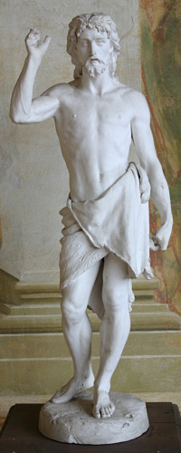 La figura del Battista, accompagnato dal consueto perizoma di pelle d'animale, è colto in atto benedicente. La mano sinistra, con tutta probabilità, doveva reggere la ciotola del battesimo o, in alternativa, la croce di verghe, lunga ed esile, suoi consueti attributi qualificanti.