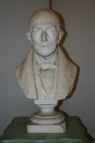 L'iscrizione a matita, successiva all'esecuzione, identifica l'effigiato con quel Angelo Riello, ricordato nella Guida della villa del 1926 tra le personalità ritratte da Ceccon. In questo caso si tratta di un modello in gesso pronto per la traduzione in marmo, come testimoniano i fori per i punti di riporto.