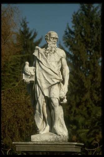 Figura allegorica maschile con libro, colomba e animale fantastico a tre teste