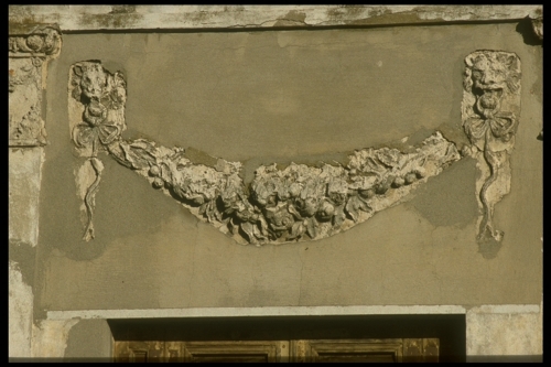 Due teste leonine sorreggono un festone di frutta e fiori.