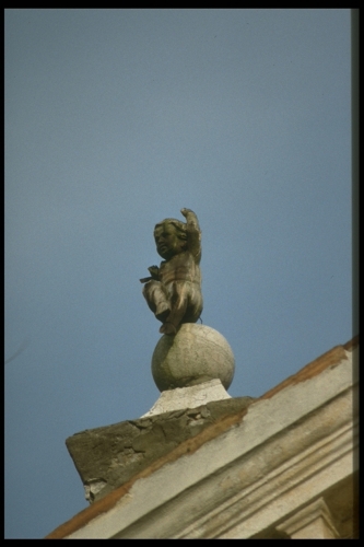 Complesso formato da villa e due barchesse. La villa è a pianta rettangolare, su due piani principali e un sottotetto. Corpo principale aggettante rispetto alle due brevi ali. Paraste ioniche in facciata terminate da timpano triangolare. Rovine neomedievali addossate all'ala occidentale. Barchessa (...)