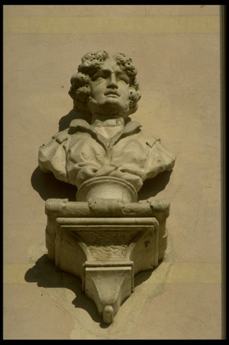 Su una mensola in pietra d'Istria è appoggiato il busto in marmo.