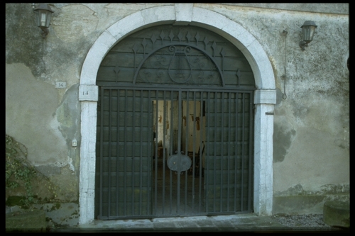Cancello a due battenti costituito da tondini in ferro posti in senso verticale con superiore rosta ornata da decorazione lanceolata lungo il perimetro esterno, mentre all'interno si trova una lira in ferro battuto tra volute.