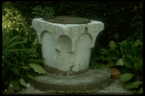 Corpo cilindrico leggermente rastremato verso il basso; sovrapposto corpoquadrato ad archetti pensili a tutto sesto; coperchio in ferro.