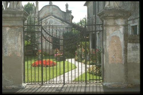 Cancello a due battenti con parti laterali fisse. Parte centrale dal profilo superiore curvilineo ribassato; motivo decorativo lanceolato.