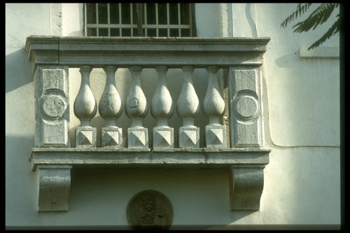 Due mensole sorreggono un piano sul quale appoggiano due pilastrini ai lati, con faccia anteriore scolpita a motivo geometrico, e in mezzo dei pilastrini con corpo ansato a vasetto poggiante sopra elemento cubico con faccia esterna scolpita a punta di diamante.