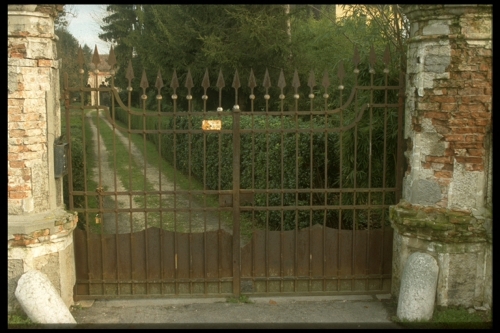 Cancello a due battenti costituito da verghe orizzontali e verticali con terminazione lanceolata su sferetta in piombo.