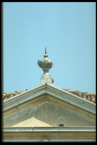 Piede circolare; corpo ansato decorato da festoncino a rilievo con due mascheroni al posto dei manici; parte superiore con puntale in ferro.