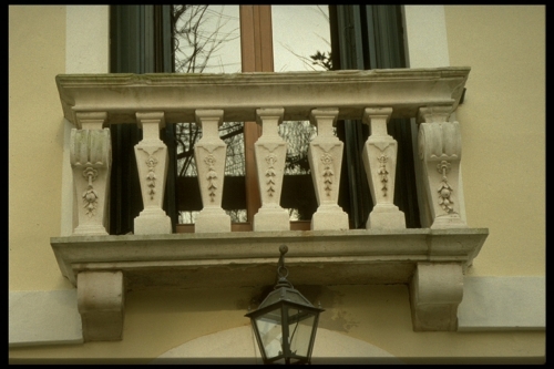 Due mensole sorreggono un basamento sul quale appoggiano due pilastrini ecinque balaustri; cimasa a modanatura composita. I pilastrini e i balaustri sono ornati nella faccia anteriore da un festoncino vegetale scolpito arilievo.