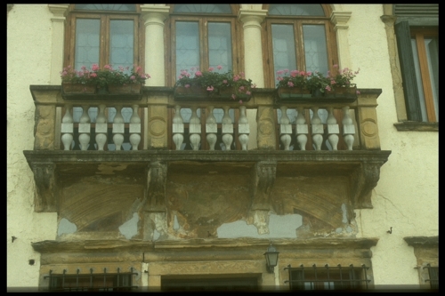 Quattro mensole sorreggono un piano a modanatura composita sul quale appoggiano quattro pilastrini con specchiatura frontale scolpita a decorazionegeometrica alternati da tre serie di cinque pilastrini composti da due elementi a forma di vasetto raccordati da un cubo lapideo.