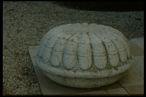 Blocco di pietra a forma elissoidale diviso in due calotte da una modanatura a toro, la calotta inferiore è liscia mentre quella superiore risulta essere lavorata a baccelli.