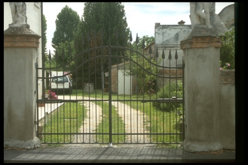 Cancello a due battenti in ferro battuto con aste orizzontali e verticali quest'ultime a terminazione lanceolata; andamento curvilineo del profilo superiore.