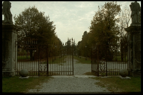 Cancello a due battenti affiancato da due parti fisse ai lati congiunte aipilastri. Terminazione superiore a motivo lanceolato. Tra il cancello e leparti fisse il raccordo è costituito da una fascia verticale ornata all'interno da motivi geometrici e a volute con sovrastante vaso di fiori stilizzato.