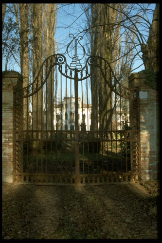 Cancello a due battenti con andamento superiore curvilineo ornato al centro da lira