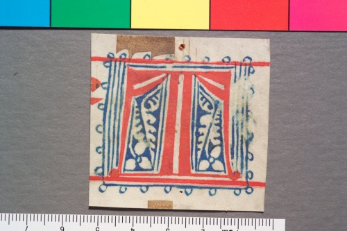 Iniziale ritagliata da un corale. Sul fronte tracce di tetragramma e di notazione quadrata; iniziale T (non Ë stato possibile ricostruire il testo cui l'iniziale era posta a capo), filigranata di penna; il corpo della lettera Ë in inchiostro rosso mentre il campo esterno presenta decoro in filigrana di penna ad inchiostro blu. A tergo tracce di tetragramma e notazione quadrata. Una riga di testo solo in parte leggibile.