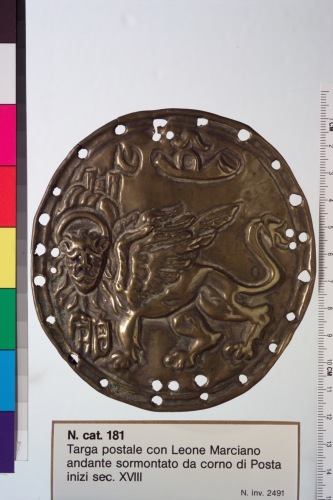placca circolare in lastra di ottone lavorata a sbalzo raffigurante il leone di San Marco andante sovrastato da corno di posta.
