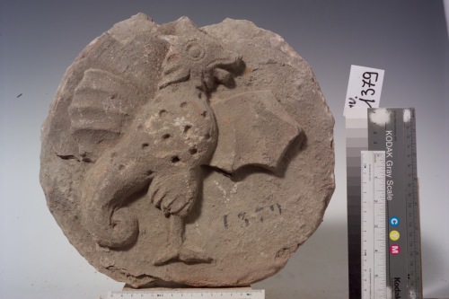 patera di forma circolare che racchiude un animale fantastico reso con zampa di volatile, coda di drago, corpo di uccello, ali e testa di probabile gallo.