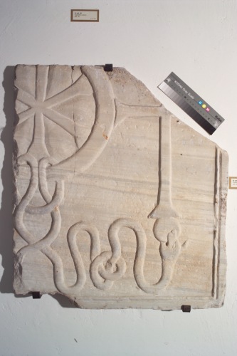 Una cornice delimita uno spazio in origine rettangolare al cui centro trovasi un chrismon all'interno di un clipeo intrecciato con dei lemnisci ad andamento sinuoso e formanti dei nodi. L'unica estremità visibile Ë costituita da una testa di serpente che sorregge in bocca un globo su cui è posta una croce latina ad estremità patenti.