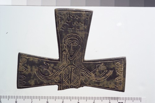 Croce metallica a braccia espanse (croce patente)con rappresentazione incisa di un santo a figura intera in atteggiamento di orante. Sopra il cui capo è incisa un'iscrizione che lo identifica in San Michele Arcangelo (Asomatos).