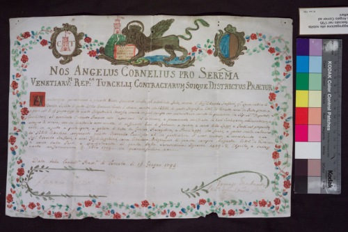 Diploma pergamenaceo rilasciato da Angelo Corner, podestà di Torcello, miniato nella parte superiore con leone andante e libro aperto affiancato a sinistra da stemma della città di Torcello e a destra da stemma del Podestà Corner, attestante l'aggregazione alla nobiltà torcellana di Odoardo Steffani. Il testo è incorniciato da decorazione floreale con fiori rossi, foglie verdi e azzurre.