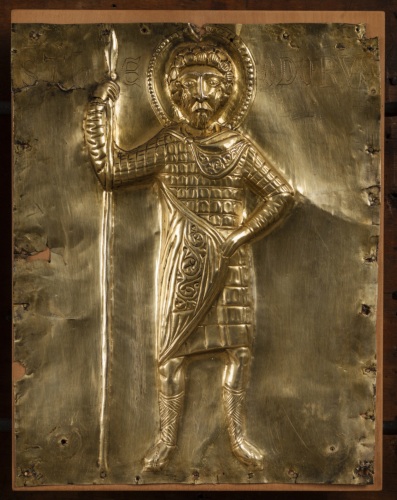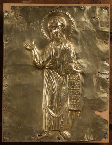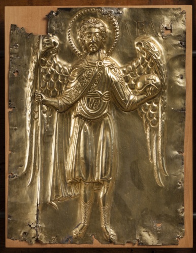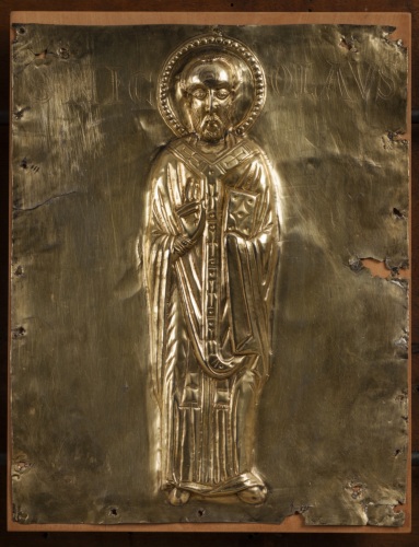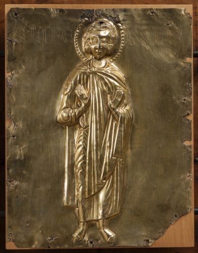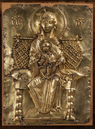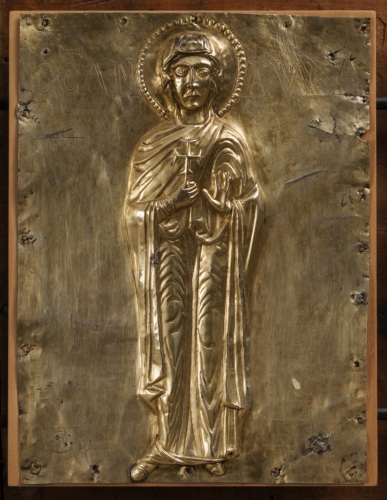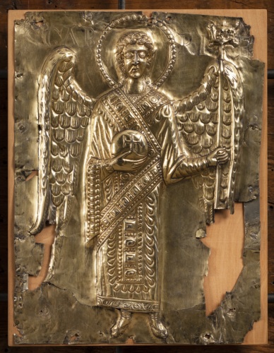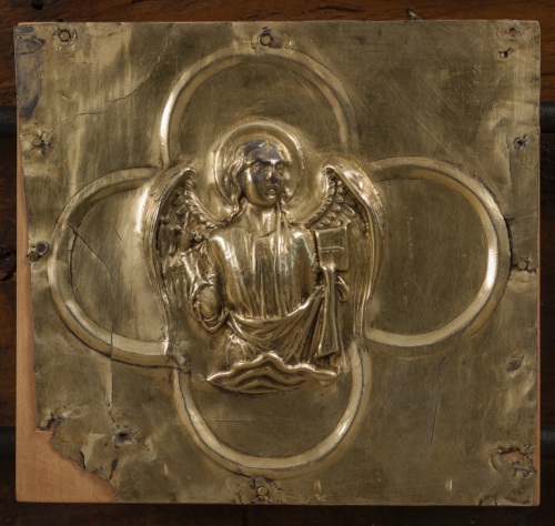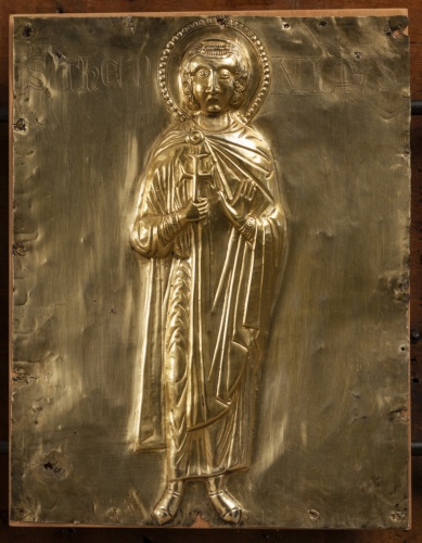 Paliotto daltare (pala doro), composto da formelle fissate su supporto ligneo, elementi superstiti di un totale di 42 (v. note): si tratta di 11 placchette in argento sbalzato, rifinito e bulino, cesellato e dorato, raffiguranti la Vergine assisa in trono a lira con il Bambino benedicente, gli arcangeli Gabriele e Michele, san Giovanni Battista, i santi profeti Isaia e Geremia, i santi Teodoro, Teonisto, Nicolò, Liberale e Maura (primo gruppo); 2 placchette recanti i simboli degli evangelista Matteo e Luca ( secondo gruppo). La tavola lignea (in legno duro, con cornice liscia a sguancio verso linterno e sporgente dal fondo) che costituiva la struttura originaria del paliotto conserva, al verso, tracce di decorazione policroma a motivi fitomorfi stilizzati e inoltre tracce della coloritura in rosso dei bordi.
