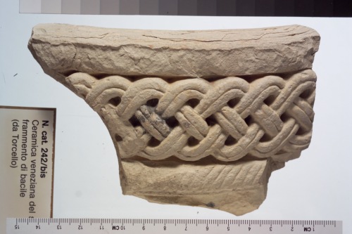 Frammento di elemento decorativo forse architettonico formato da una fascia a intreccio compresa fra un toro superiore e un collarino a torciglione semplificato.