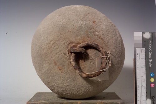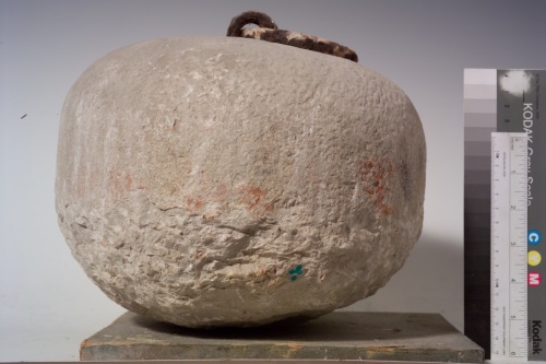 l'oggetto lapideo, di forma tondeggiante leggermente schiacciata, è piatto alla base e ha un anello di ferro sulla parte sommitale.