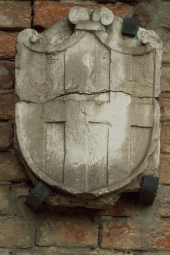 stemma dalla superficie ondulata su blocco da incasso. Lo scudo Ë attraversato da cinque bande verticali e una centrale orizzontale che si incrocia con le precedenti sommità, si conclude con due riccioli al centro e ai lati. E' contornato da una sottile incorniciatura che si conclude alla sommità con due riccioli al centro e ai lati.