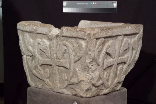 le facce sono tutte decorate allo stesso modo. Superiormente corre un listello grossolano a segnare il bordo. Al di sotto di esso campeggia una croce centrale ad estremità patenti. Dalla sua base parte un tralcio per lato con andamento arcuato tale da richiudersi verso il braccio superiore della croce. Dalla sommità del tralcio trae origine una foglia d'edera che ricade con la punta in direzione dell'incrocio dei bracci. Dal tralcio partono inoltre varie fogliette ovoidali e ramificazioni secondarie.