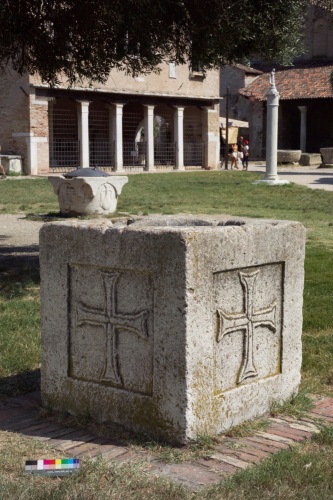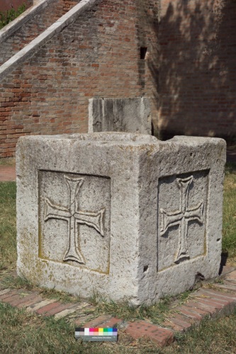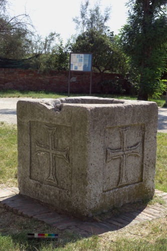 pozzo cubico in pietra: su tutte le quattro facce, all'interno di un quadrato in cavato e a fondo liscio, campeggia una croce greca ad estremità patenti. Una scanalatura corre lungo i bordi.