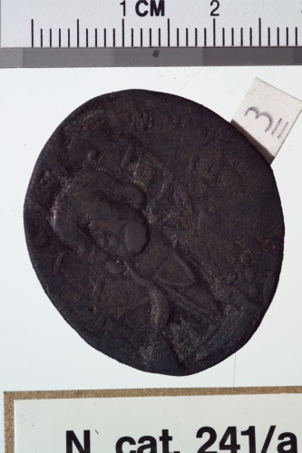 Moneta bizantina follis anonimo attribuito a Romano III. Sul recto busto frontale di Cristo. Sul verso croce su basamento a tre gradini accompagnata da iscrizione.