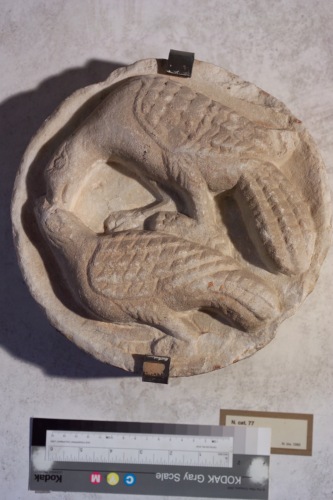 patera di forma circolare che rappresenta un uccello nel partito superiore nell'atto di ghermire e beccare un altro uccello posto nel campo inferiore.